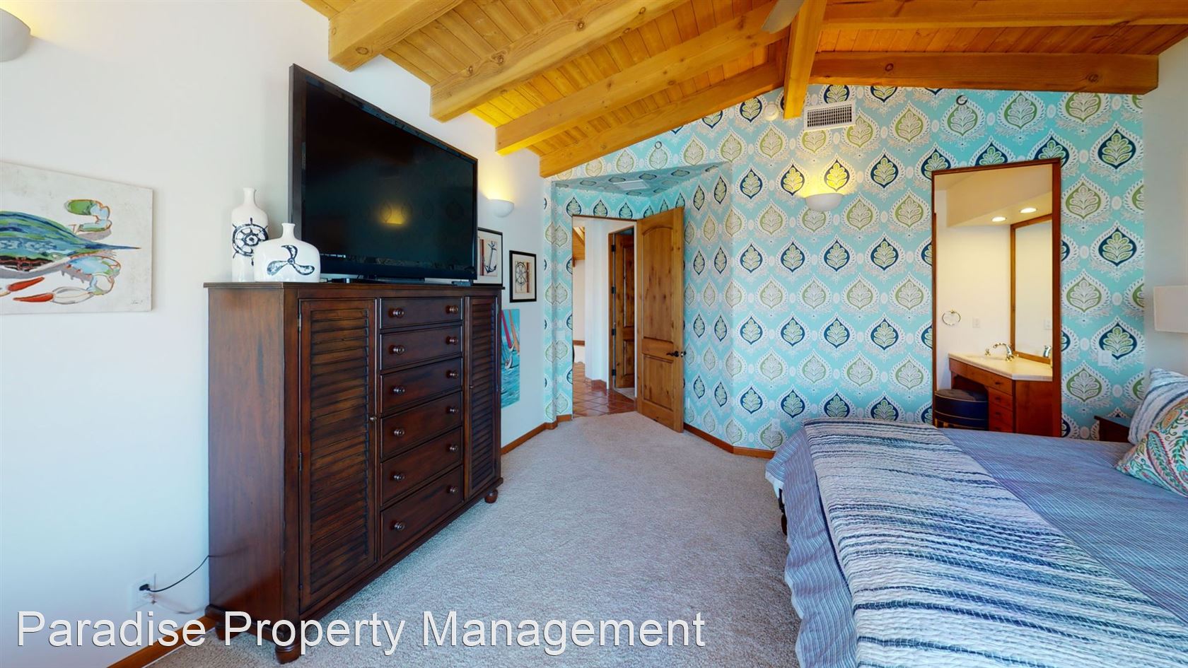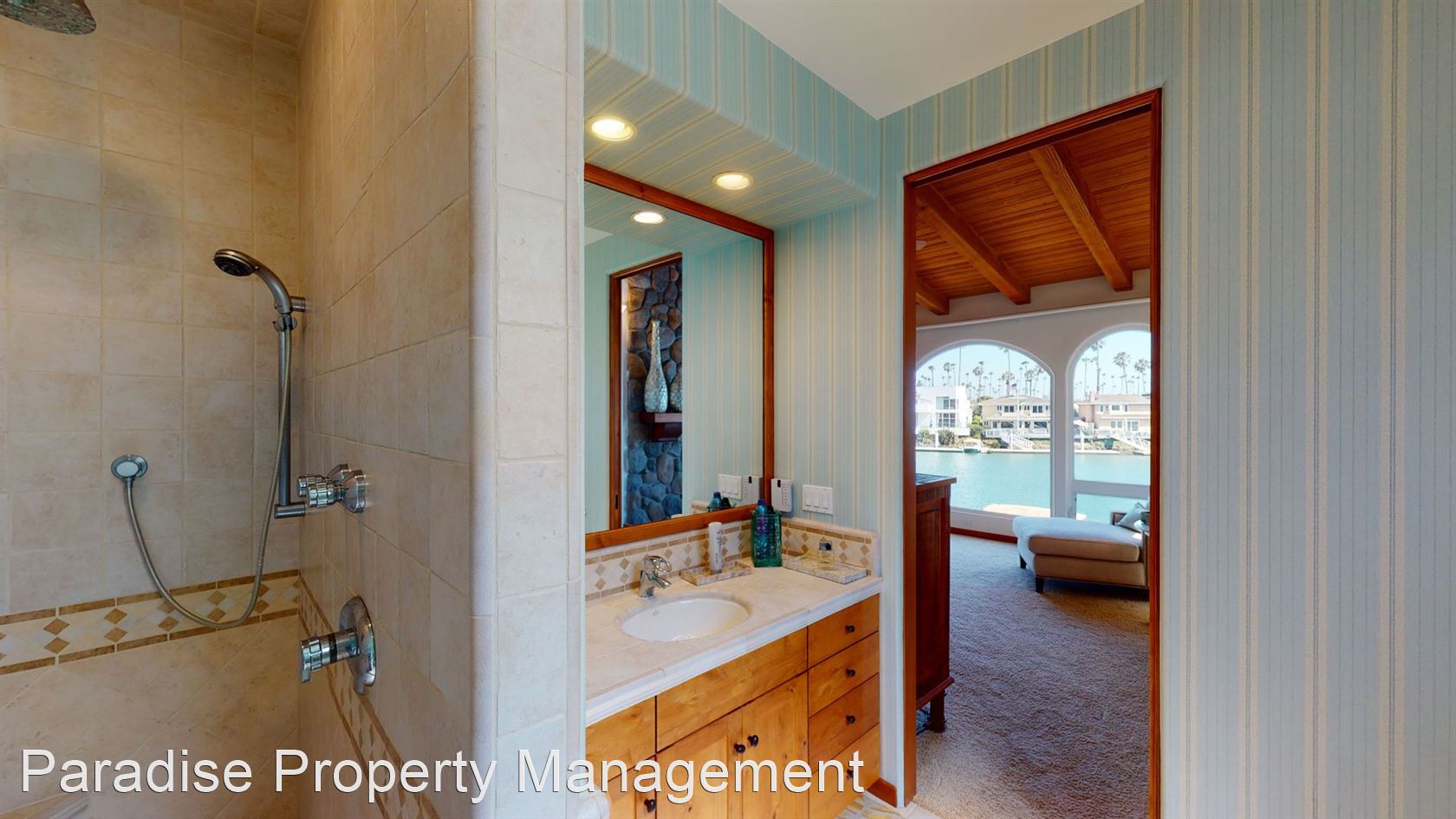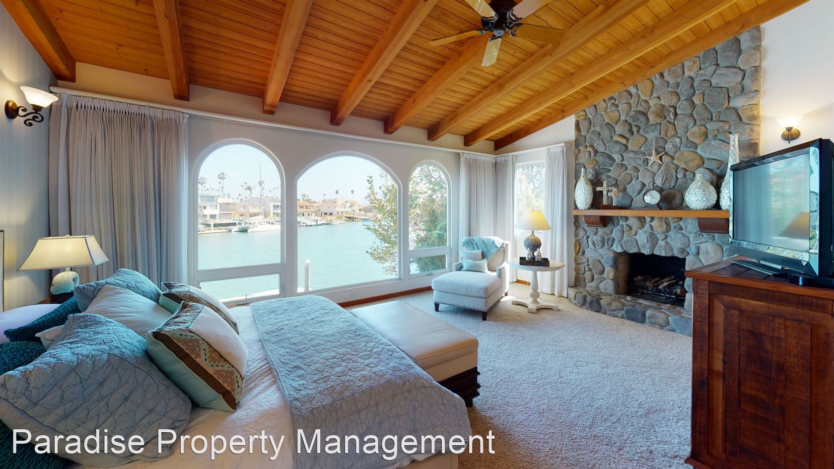 The first master suite has wood beam vaulted ceilings, custom wall sconces, a large walk in closet and en-suite bathroom with dual vanities, and the second master suite features a stone gas fireplace, amazing water views, vaulted wood beam ceilings, en-suite bathroom, and walk-in closet.