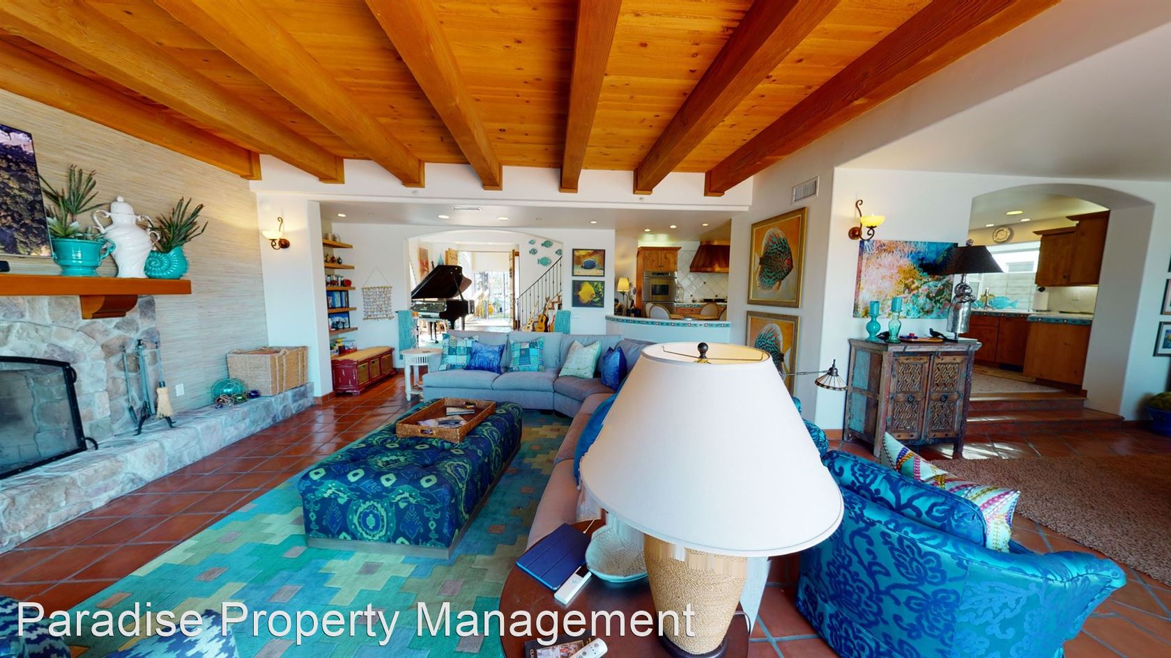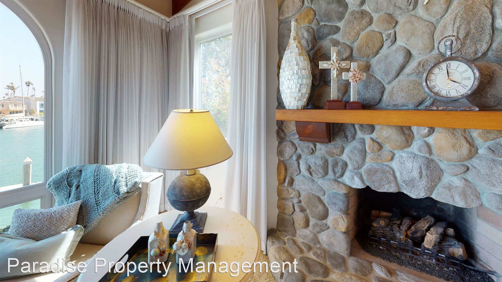 The large open living room features a stone wood-burning fireplace, natural wood beam ceilings and again that special water view.