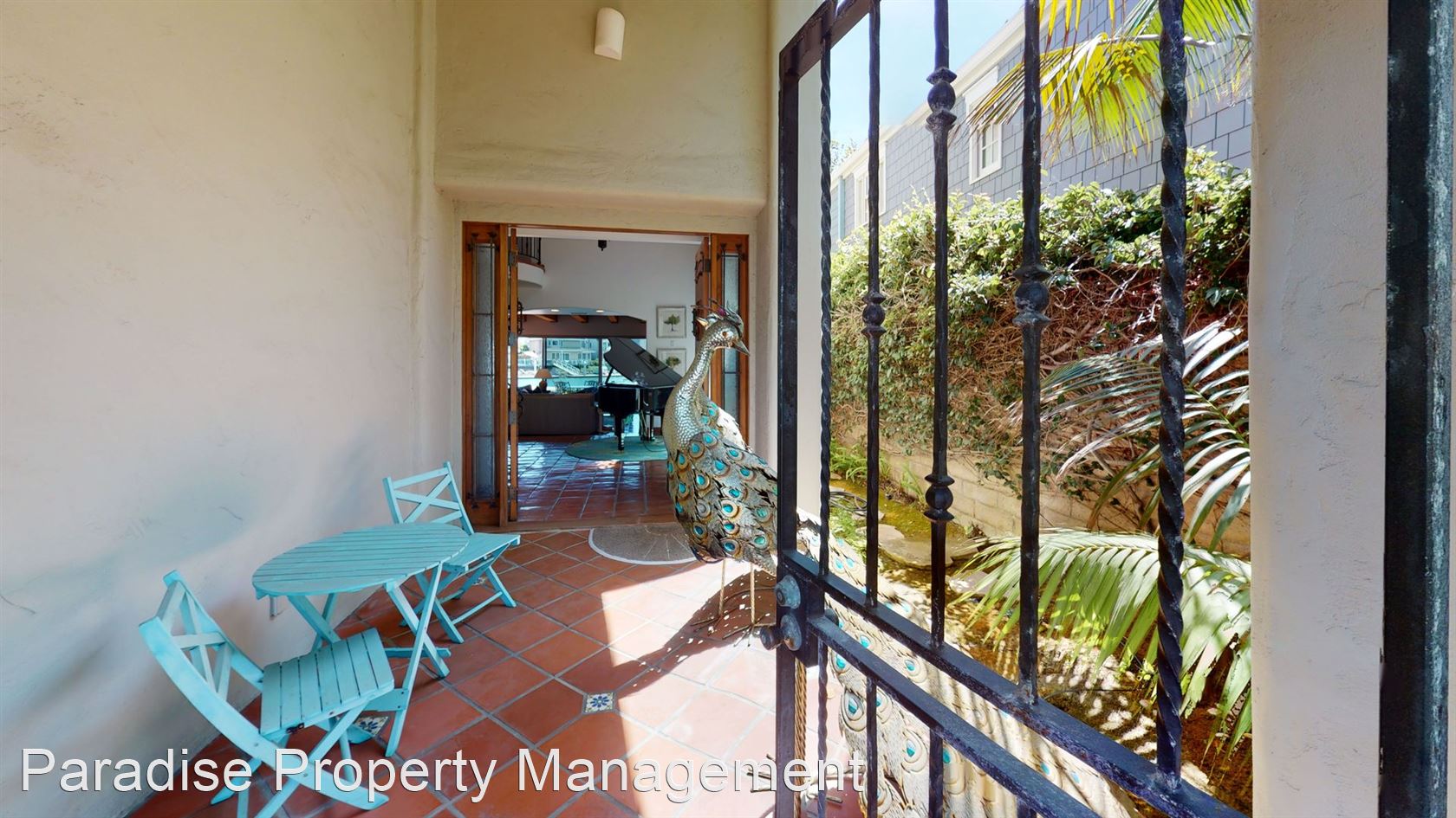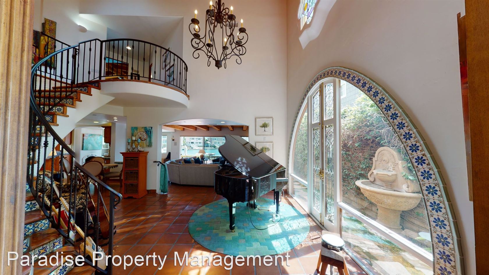 The decorative winding staircase with Spanish paver flooring and accent tiles deliver you to the second level that features a large family/great room, and two master bedroom suites, each with en-suite baths.